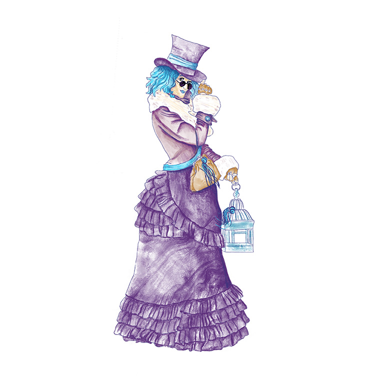 Ez a karakteres illusztráció a múlt eleganciáját ötvözi a modern fantasy világával. A lila fodros ruha, a türkiz haj és a rejtélyes lámpás egy olyan világba kalauzol, ahol a stílus és a kaland kéz a kézben jár. Tökéletes választás azoknak, akik szeretik az egyedi, karakterközpontú alkotásokat és a merész színhasználatot, a cosplayt.