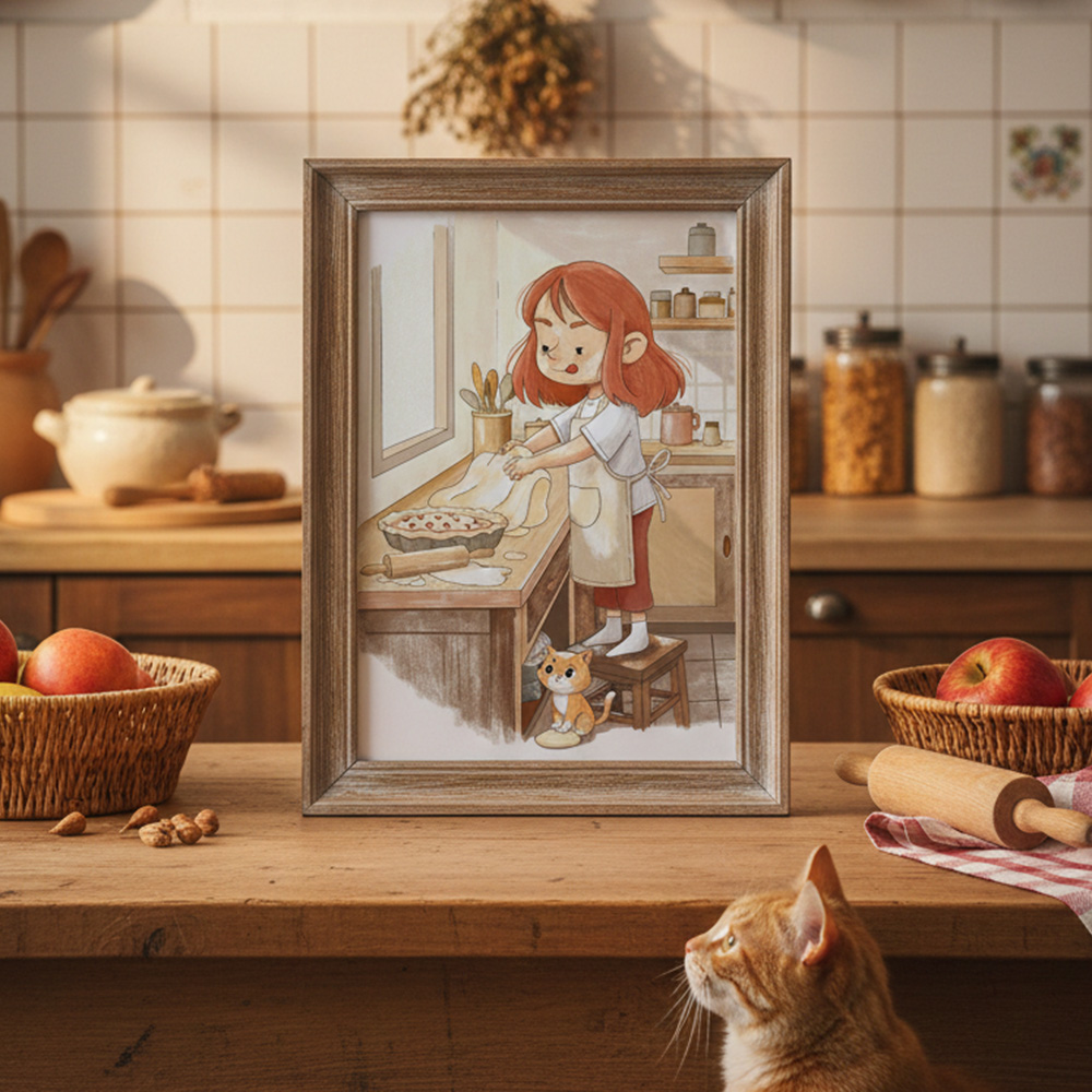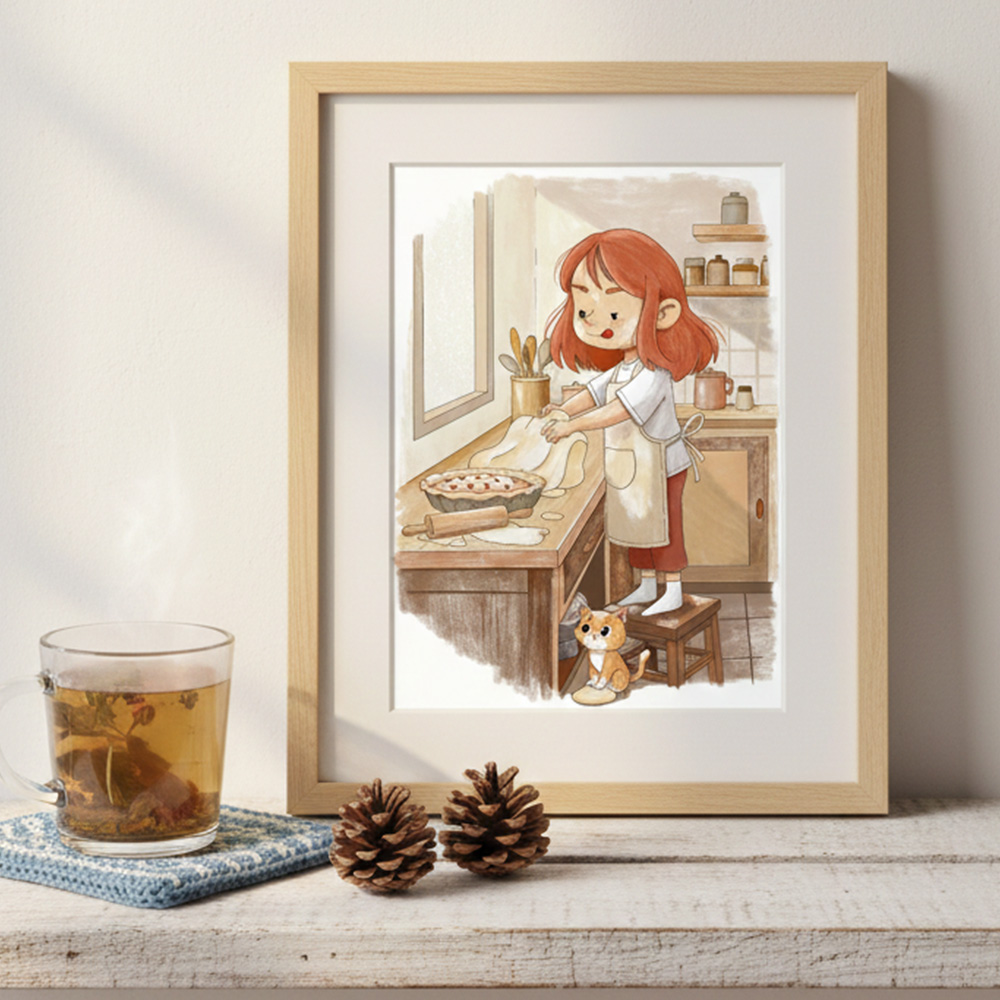 This illustration will tell a little story on your wall. With its clean lines and soft pastel tones, it perfectly complements Scandinavian-style nurseries, vintage kitchens, or modern minimalist spaces that need a touch of softness.