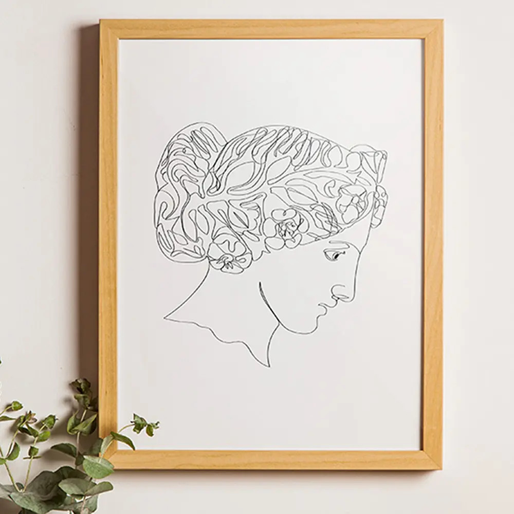 Experience the harmonious connection between nature and the human soul with this exquisite one-line art female portrait. The fluid, continuous black line traces a face of antique beauty, crowned by delicate floral motifs that bloom from within. The contrast between the clean white background and the intricate linework radiates elegance and intellectual depth, making it a true jewel for any modern home.