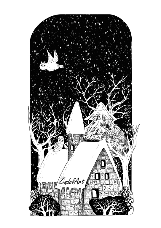 Ez a részletgazdag, fekete-fehér illusztráció a téli éjszakák csendjét és misztikumát hozza el az otthonodba. A havas háztetők, a kopár ágak és az éjszakai égbolton átsuhanó baglyok egy mesebeli világba repítenek, ahol megáll az idő.