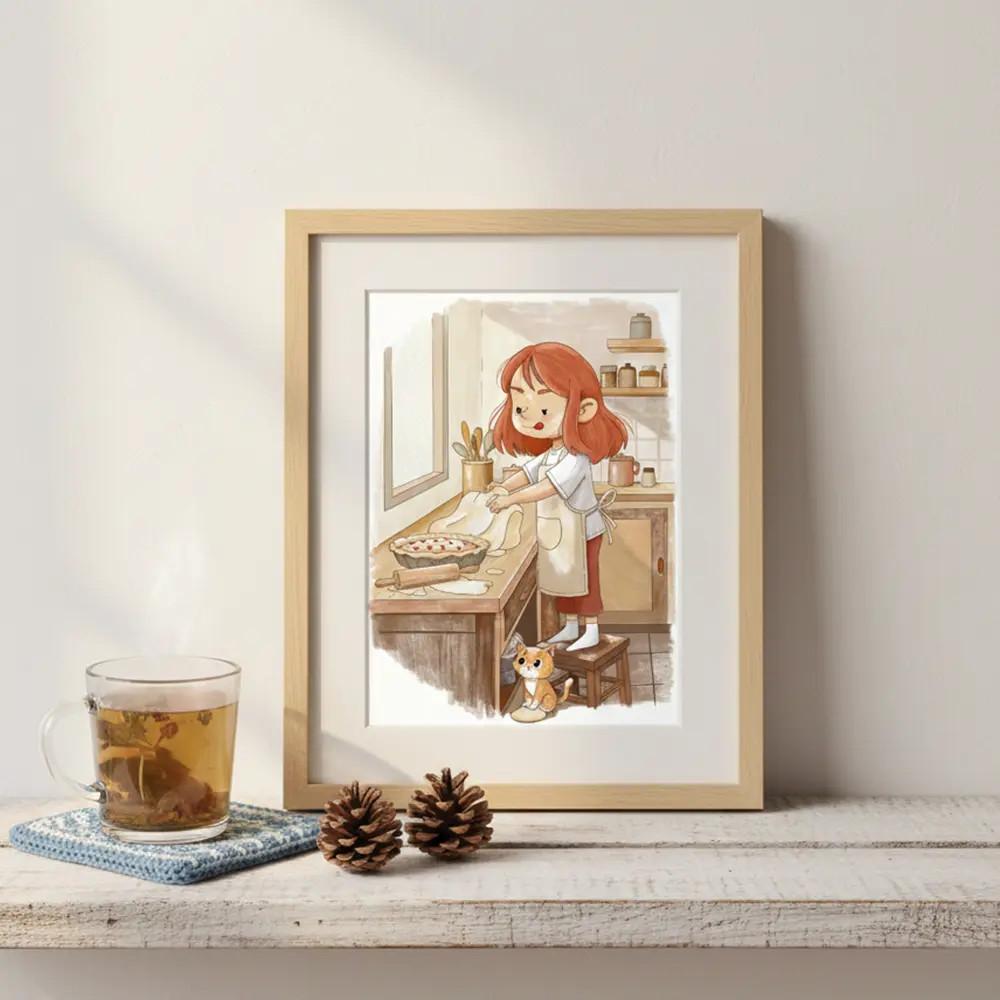 This illustration will tell a little story on your wall. With its clean lines and soft pastel tones, it perfectly complements Scandinavian-style nurseries, vintage kitchens, or modern minimalist spaces that need a touch of softness.