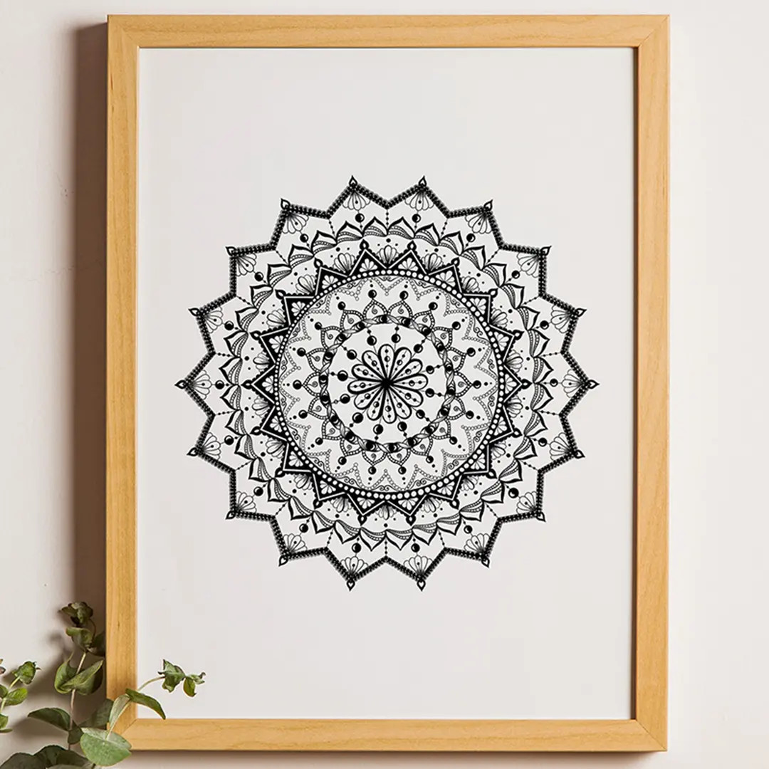 Create harmony and focus in your home with this stunning, hand-drawn style black and white mandala. Starting from a central floral motif, the layered lace-like patterns and geometric forms create a twelve-pointed star, symbolizing wholeness and inner balance. The contrast of the intricate dotwork and delicate vines makes this piece a modern yet timeless decoration that radiates serenity.