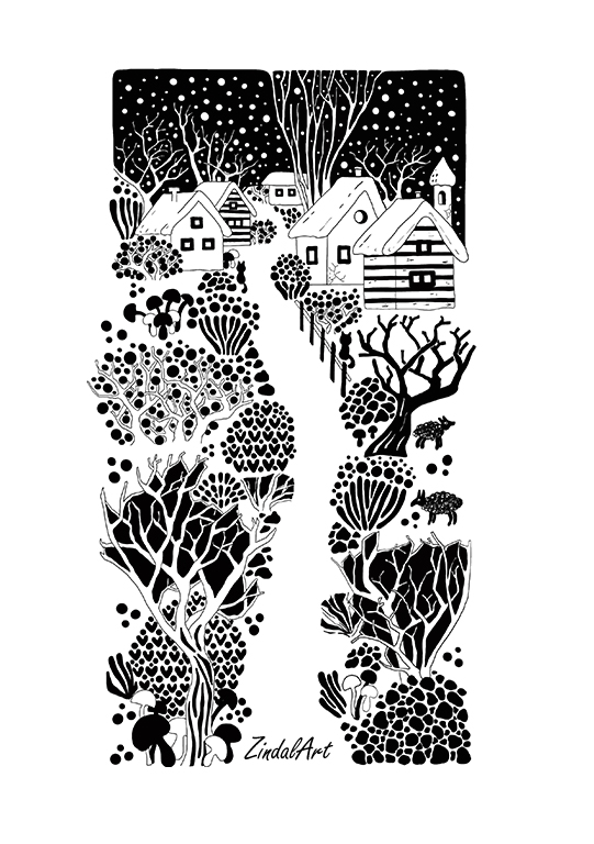 Ez a gazdagon részletezett, fekete-fehér illusztráció a vidéki tél legszebb pillanatait idézi meg. A hófödte faházak, a legelésző bárányok és a mesebeli gombák világa egy olyan helyre kalauzol, ahol a csendnek is története van. Tökéletes választás a természet és a népies motívumok, a linómetszetek kedvelőinek.
